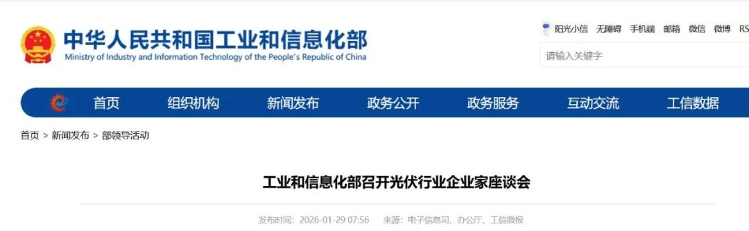 2026年1月28日下午,工业和信息化部党组书记、部长李乐成主持召开光伏行业企业家座谈会,深入贯彻落实党中央、国务院决策部署,听取重点企业及光伏行业协会对“反内卷”工作的意见建议,研究部署推进光伏行业治理工作。副部长熊继军出席会议。
