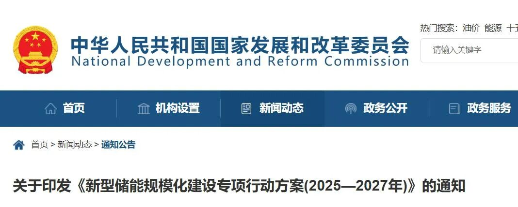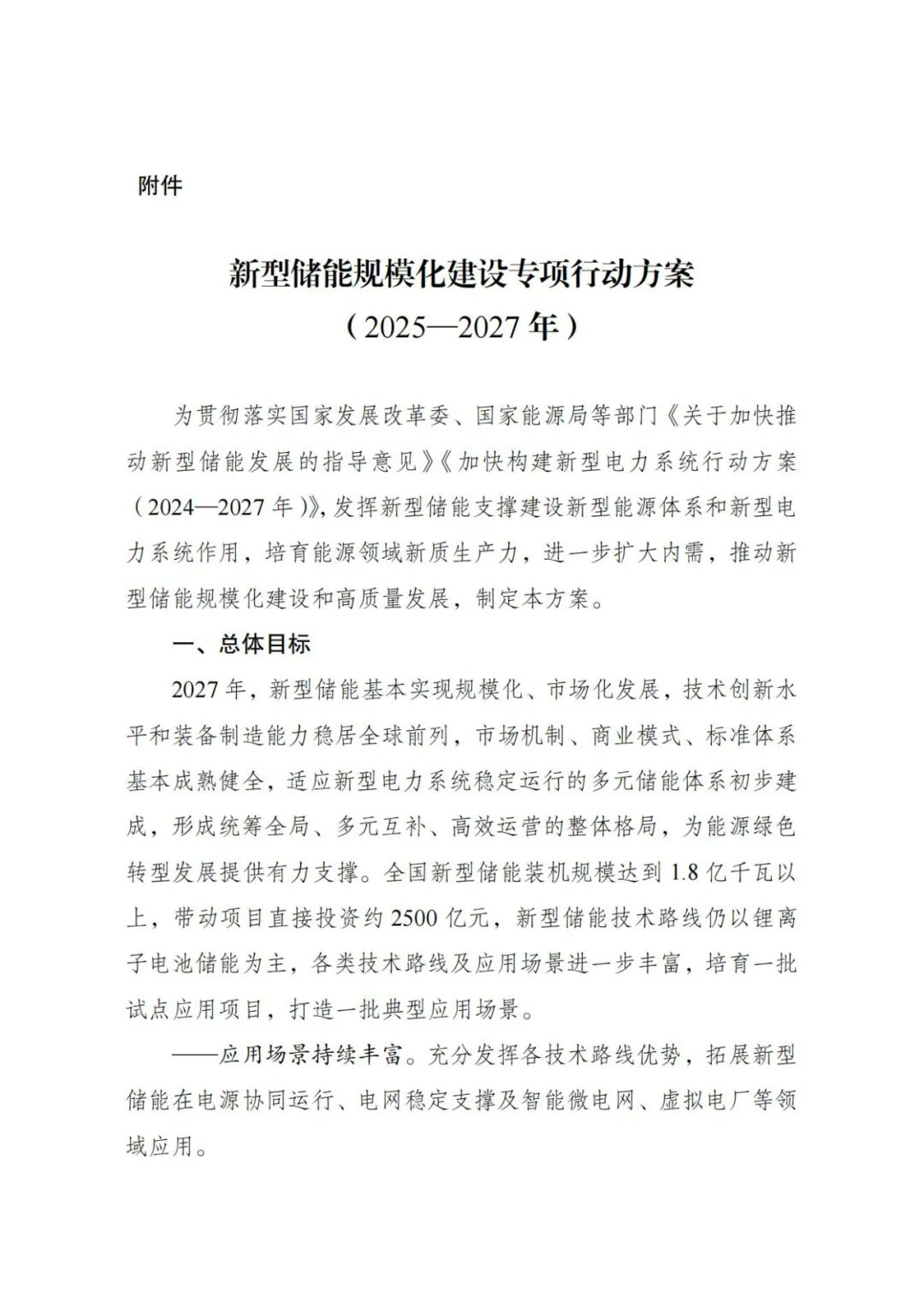 国家发改委,能源局发布《新型储能规模化建设专项行动方案(2025—2027年)》,目标到2027年全国新型储能装机规模达到1.8亿千瓦以上,促进新型储能应用场景拓展,推动新型储能利用水平提升,加快新型储能市场机制完善。