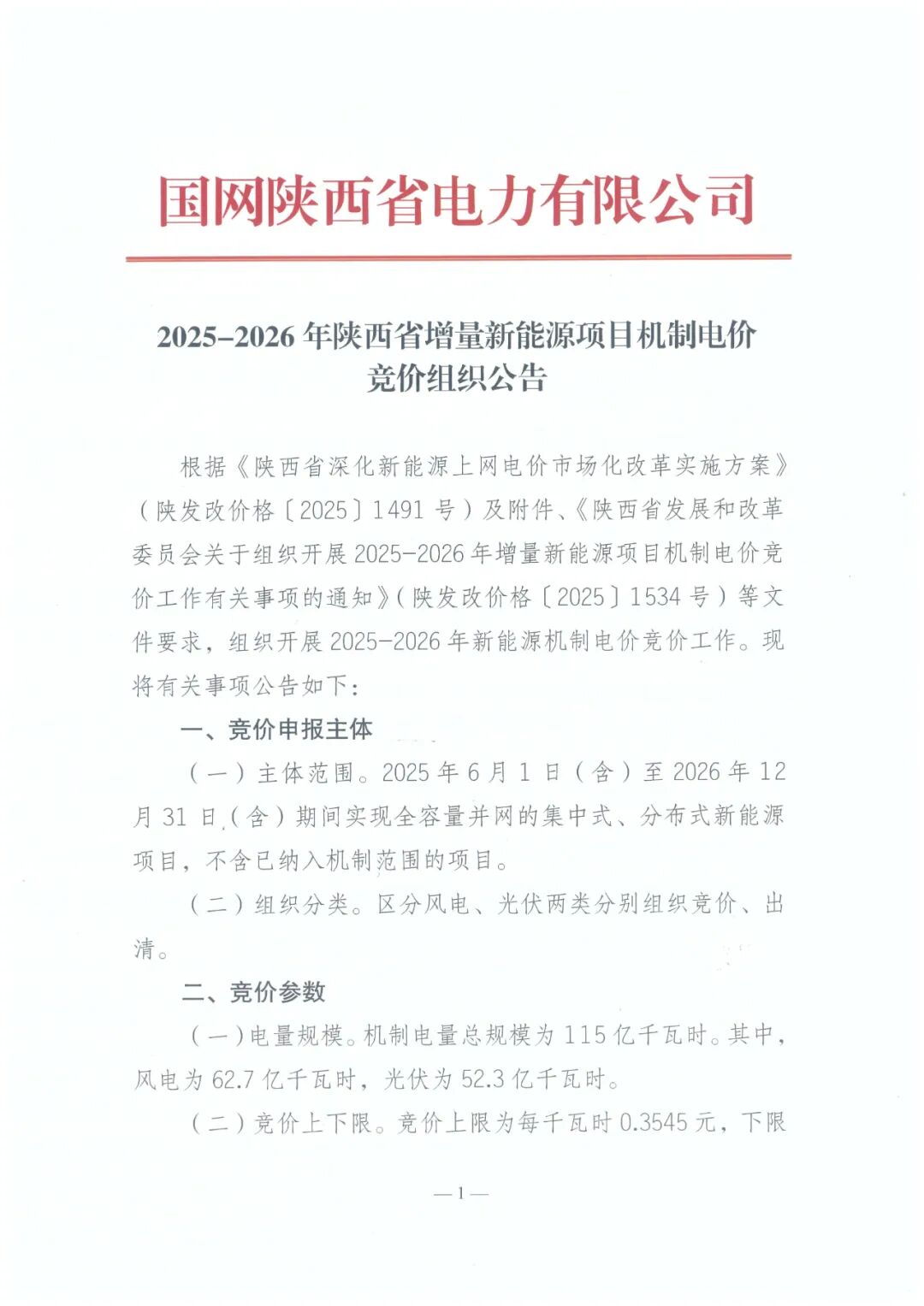11月10日,国网新能源云公示《2025-2026年陕西省增量新能源项目机制电价竞价组织公告》。