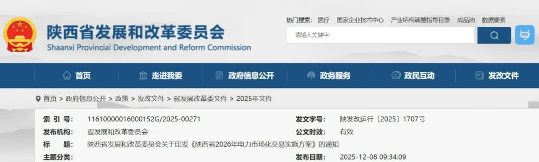 12月7日,陕西省发展和改革委员会印发《陕西省2026年电力市场化交易实施方案》。方案明确: